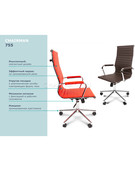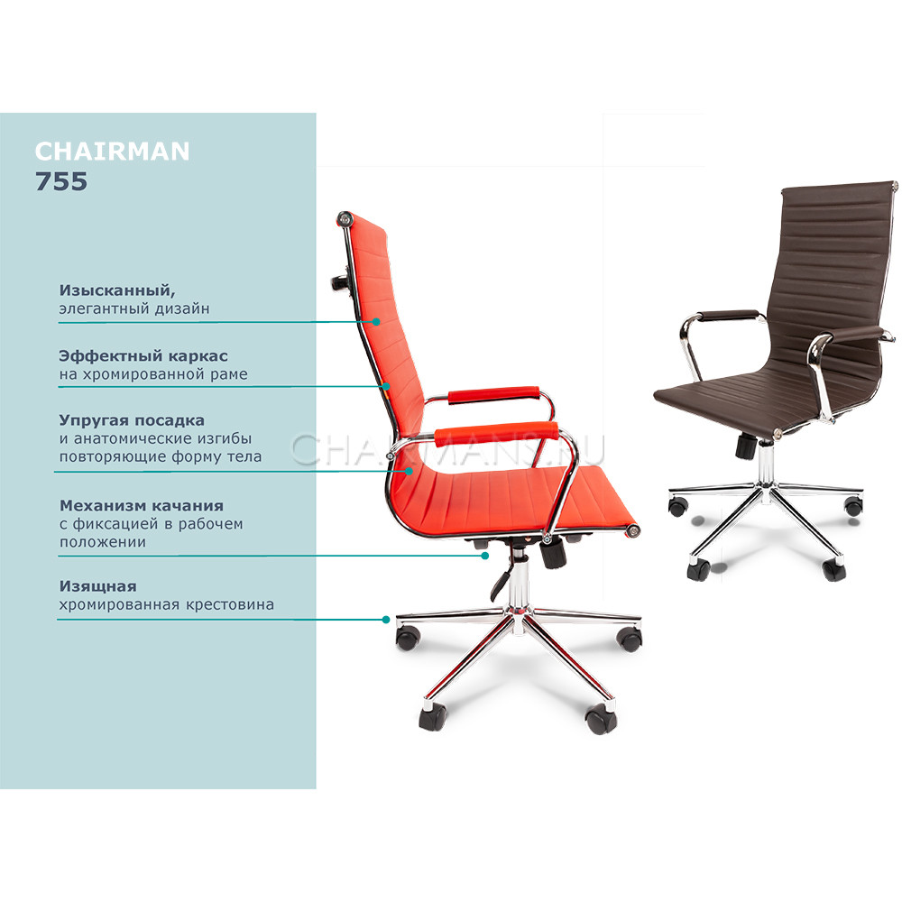 CHAIRMAN 755 Изящный силуэт и эффектный хром притягивают взгляды, а анатомические изгибы дарят непревзойденный комфорт. Упругая и комфортная посадка средней жесткости и анатомическая форма спинки. Кресло для тех, кто предпочитает сфокусироваться на важном, не отвлекаясь на лишнее. Строгость и графичность линий подчеркнута хромированными элементами и смотрится особенно элегантно и привлекательно. Особенности: Изысканный, элегантный дизайн. Эффектный каркас на хромированной раме. Упругая посадка и анатомические изгибы повторяющие форму тела. Механизм качания с фиксацией в рабочем положении. Изящная хромированная крестовина.