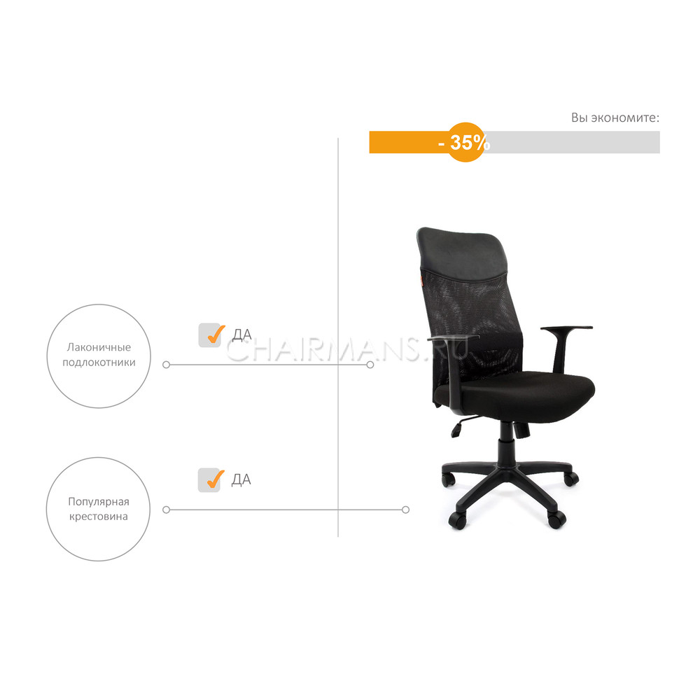 Добавить еще больше рациональной простоты в кресла CHAIRMAN непростая задача. Нужно сохранить их дизайн, эргономику, качество, надежность и долговечность, и при этом – добиться заметного результата в упрощении. И кресла обязательно должны стать дешевле – иначе смысла в таких доработках нет. CHAIRMAN 610 Lite упращенная форма CHAIRMAN 610. Особенности: Надежная популярная крестовина из прочного, долговечного и безопасного пластика, а также современные, удобные подлокотники. Эргономичная форма, «дышащая» сетчатая спинка на легком металлическом каркасе, прогрессивный, лаконичный дизайн.