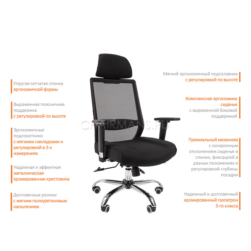 Современное руководительское кресло. Стильное, очень удобное, функциональное и недорогое. Или премиальное кресло для сотрудников. Опять же стильное, удобное и функциональное. А может отличное комфортное кресло для домашнего рабочего места? Да, все это CHAIRMAN 555 в комплектации « LUX ». Особенности: Упругая сетчатая спинка эргономичной формы. Выраженная поясничная поддержка с регулировкой по высоте. Эргономичные подлокотники с мягкими накладками и регулировкой в 3 х измерениях. Надежная и эффектная металлическая хромированная крестовина. Долговечные ролики с мягким полиуретановым напылением. Мягкий эргономичный подголовник с регулировкой по высоте. Комплексная эргономика сиденья с выраженной боковой поддержкой. Премиальный механизм с синхронным отклонением сиденья и спинки, фиксацией в разных положениях и регулировкой глубины посадки. Надежный и долговечный хромированный газпатрон 3 го класса.