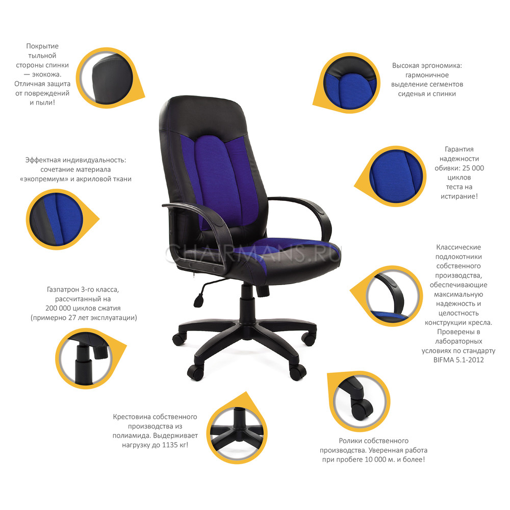CHAIRMAN 429. Это — надежная, проверенная временем конструкция. Это — проверенные и привычные комплектующие: подлокотники, крестовина… но главное — в другом. CHAIRMAN 429 — это весьма нетривиальное сочетание материала «экопремиум» и акриловой ткани, придающее креслу яркий, современный облик. А гармоничное выделение сегментов сиденья и спинки кресла за счет прострочки обеспечивает дополнительный уровень эргономики. Особенности: Покрытие тыльной стороны спинки — экокожа. Отличная защита от повреждений и пыли! Эффектная индивидуальность: сочетание материала «экопремиум» и акриловой ткани. Газпатрон 3-го класса, рассчитанный на 200 000 циклов сжатия (примерно 27 лет эксплуатации). Высокая эргономика: гармоничное выделение сегментов сиденья и спинки. Гарантия надежности обивки: 25 000 циклов теста на истирание! Классические подлокотники собственного производства, обеспечивающие максимальную надежность и целостность конструкции кресла. Проверены в лабораторных условиях по стандарту BIFMA 5.1-2012. Крестовина собственного производства из полиамида. Выдерживает нагрузку до 1135 кг! Ролики собственного производства. Уверенная работа при пробеге 10 000 м. и более!