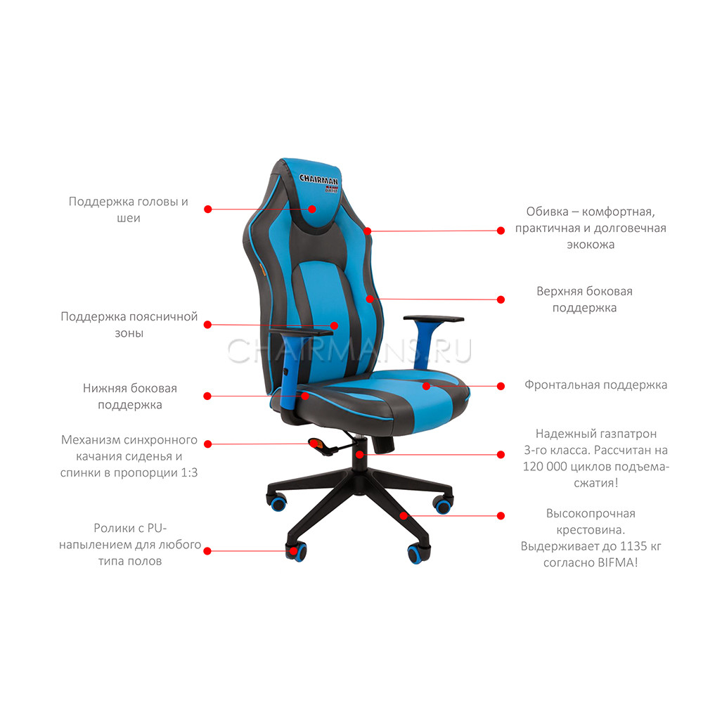 Что такое комфорт геймерскогокресла? Нет, это не расслабленная вальяжность мебели для отдыха. Это – способность генерировать энергию. Энергию движения и побед. Эргономика, позволяющая принять действительно удобную позу и не задумываться об этом. Возможность играть или работать много часов подряд, сохраняя бодрость и хорошее настроение. И, конечно, прочность и надежность. Все это – CHAIRMAN GAME 23. Особенности: По-спортивному подтянутая, яркая и современная модель. Эффектный цветной кант. Стильная тонкая крестовина SLIM. Дизайнерское решение – сочетание темно-серого с яркими вставками основного цвета. Основания подлокотников в цвет обивки. Выглядит круто!. Ролики с цветным полиуретановым покрытием. Регулируемые подлокотники собственного производства. Поддержка головы и шеи. Поддержка поясничной зоны. Нижняя боковая поддержка. Механизм синхронного качания сиденья и спинки в пропорции 1:3. Ролики с PU-напылением для любого типа полов. Обивка – комфортная, практичная и долговечная экокожа. Верхняя боковая поддержка. Фронтальная поддержка. Надежный газпатрон 3-го класса. Рассчитан на 120 000 циклов подъема- сжатия!. Высокопрочная крестовина. Выдерживает до 1135 кг согласно BIFMA!