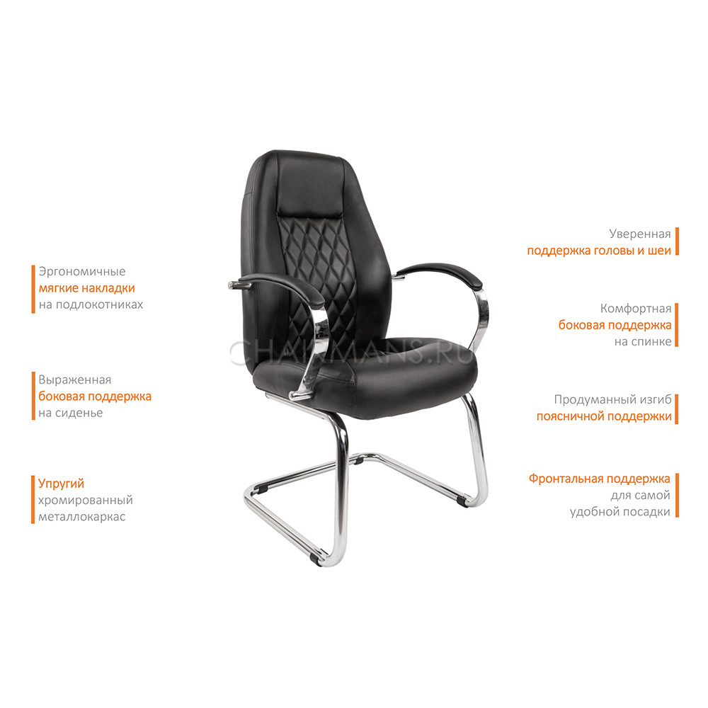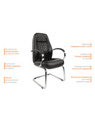 Солидный классический облик, гармонично дополненный современными чертами. Эффектная респектабельность элегантных хромированных деталей. Потрясающий комфорт – как в премиальном авто. Доступная цена. Соединить все это вместе. Смешать, но не взбалтывать. Это – рецепт идеального кресла для посетителей. Такого, как CHAIRMAN 950 V. Особенности: Эргономичные мягкие накладки на подлокотниках. Выраженная боковая поддержка на сиденье. Упругий хромированный металлокаркас. Уверенная поддержка головы и шеи. Комфортная боковая поддержкана спинке. Продуманный изгиб поясничной поддержки. Фронтальная поддержка для самой удобной посадки.