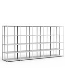Металлический полочный усиленный стеллаж модели СТФУ, сборно-разборного типа, предназначен для хранения малогабаритных грузов, архивной документации, оргтехники, различных товаров и продукции в помещениях офисов, архивов, библиотек и складов. Возможно бытовое использование металлического стеллажа СТФУ для хранения различного инвентаря, инструментов и домашней утвари в гаражах, на балконах и даче. Способ крепления полок к стойкам – болтовое соединение, при помощи болтов М6х16 и фланцевых гаек М6; Шаг регулировки горизонтальных полок по высоте составляет 25 мм. Полки выполнены из качественной холоднокатаной стали марки 08 ПС; Допустимая равномерно распределенная нагрузка на каждую полку СТФУ до 200 кг; В собранном виде, металлический полочный стеллаж СТФУ представляет собой абсолютно жесткую, прочную и устойчивую конструкцию, безопасную для эксплуатации потребителем. Для обеспечения жесткости конструкции стеллажа, нижняя горизонтальная пока устанавливается на расстоянии не более 150 мм от пола и крепится по 4 углам к стойкам через металлические уголки жесткости. Верхние уголки жесткости крепятся к 4 углам полки, расположенной на расстоянии не более 2 м от пола. Для сохранности напольного покрытия, каждая стойка стеллажа СТФУ комплектуется съемным пластиковым подпятником. Конструктив металлического полочного стеллажа СТФУ позволяет собирать, как отдельно стоящий стеллаж, так и многосекционный стеллаж, состоящий из основной секции и неограниченного числа дополнительных секций. Стойки металлического стеллажа СТФУ представляет собой сложный, фигурный холодно-катанный профиль «Г»-образной формы. Дополнительную жесткость, увеличение нагрузочных характеристик, а так же травмобезопасность эксплуатации металлической стойки СТФУ обеспечивают завальцованные продольные края. Стойки и полки окрашены полимерной (порошковой) краской RAL 7035 светло-серого цвета.