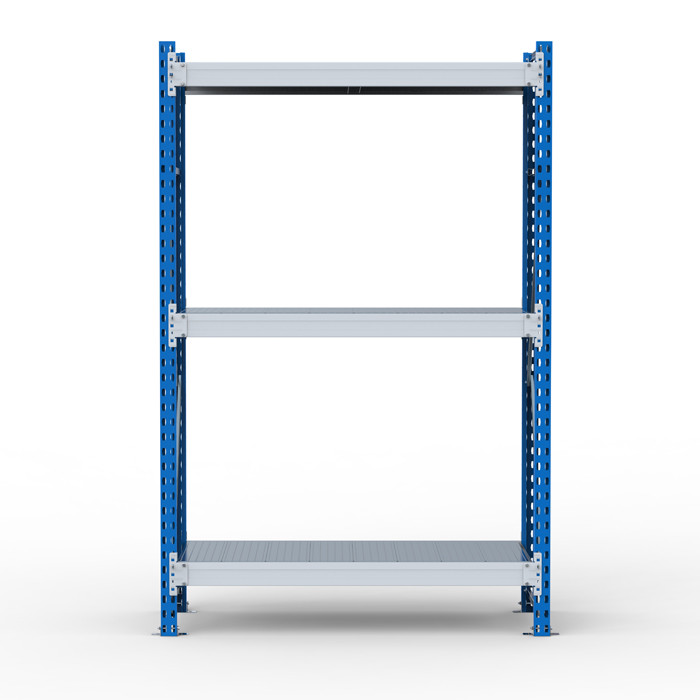• Среднегрузовой стеллаж SGR состоит из рам (сборная конструкция из двух стоек, соединенных горизонтальными и наклонными стяжками), продольных балок с креплением к стойкам на зацепах и металлических настилов, размещенных на продольных балках. • Технология крепления балки к стойкам - безболтовая, на зацепах. Такой подход значительно уменьшает время сборки и установки стеллажа. Конструкция позволяет менять положение полок без демонтажа всей секции. • Ярус хранения включает в себя две балки и настил, составленный из оцинкованных полок. • К раме стеллажа можно присоединить дополнительные секции на зацеп. Нагрузочные характеристики при добавлении доп.секций сохраняются • Допустимое минимальное количество ярусов хранения на каждую секцию - не менее трёх штук. • Для предотвращения случайного съёма балок яруса с рам предусмотрен фиксатор, устанавливаемый в конце сборки в прямоугольное отверстие каждого зацепа. • Каждая стойка снабжена металлическим подпятником на болтовом креплении. • Стеллаж комплектуется необходимой фурнитурой для сборки. • Стойки окрашены полимерной (порошковой) краской RAL 5015 синего цвета или RAL7035 светло-серого цвета, балки окрашены в RAL7035 светло-серого цвета.