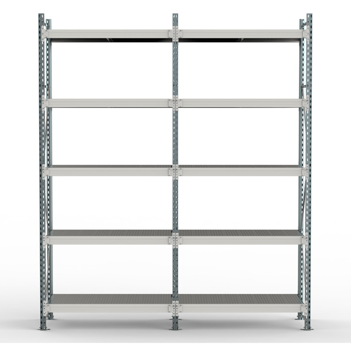 • Среднегрузовой стеллаж SGR состоит из рам (сборная конструкция из двух оцинкованных стоек, соединенных горизонтальными и наклонными стяжками), продольных балок с креплением к стойкам на зацепах и оцинкованных металлических настилов, размещенных на продольных балках. • Технология крепления балки к стойкам - безболтовая, на зацепах. Такой подход значительно уменьшает время сборки и установки стеллажа. Конструкция позволяет менять положение полок без демонтажа всей секции. • Ярус хранения включает в себя две балки и настил, составленный из оцинкованных полок. • К раме стеллажа можно присоединить дополнительные секции на зацеп. Нагрузочные характеристики при добавлении доп.секций сохраняются • Допустимое минимальное количество ярусов хранения на каждую секцию - не менее трёх штук. • Для предотвращения случайного съёма балок яруса с рам предусмотрен фиксатор, устанавливаемый в конце сборки в прямоугольное отверстие каждого зацепа. • Каждая стойка снабжена металлическим подпятником на болтовом креплении. • Стеллаж комплектуется необходимой фурнитурой для сборки. • Стойки окрашены полимерной (порошковой) краской RAL 5015 синего цвета или RAL7035 светло-серого цвета, балки окрашены в RAL7035 светло-серого цвета.