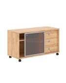 Каркас из ЛДСП т.25 мм, полки и задняя стенка из ЛДСП т.18мм. Тумба мобильная комплектуется стеклянной слайд-дверью в алюминиевой рамке, стекло тонированное пленкой, бронза. Ручки кнопки, цвет алюминий. Ящики-фолдинги размером 400х539х400, можно устанавливать и слева и справа. Роликовые направляющие.
