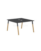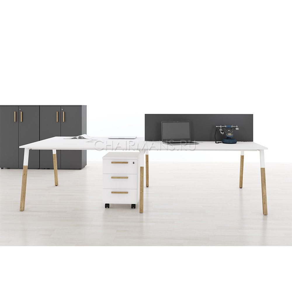 Столешницы из ЛДСП толщиной 18мм c кромкой ABS толщиной 2мм, каждая комплектуется квадратной заглушкой кабель-канала по центру и каждая 2-мя траверсами. Между столешницами имеется зазор 6 мм для установки настольных экранов. Опоры комбинированные А-образной формы, верхняя часть из профиля трубы 40х40мм и нижняя часть из массива бука; отделка – масло-воск. Опоры имеют регулировку внизу.