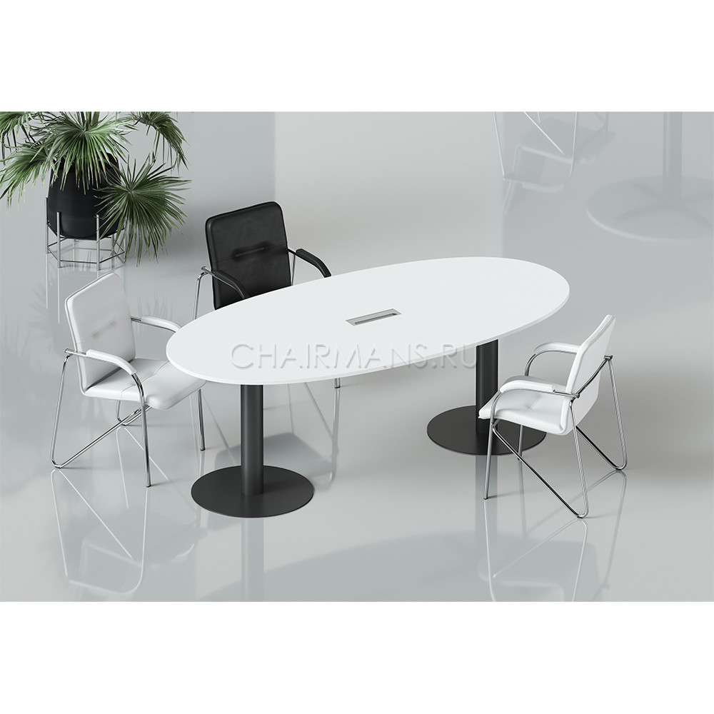 Столешница из ЛДСП толщиной 22 мм с кромкой ПВХ толщиной 2 мм. Опоры металлические с круглым основанием, диаметр трубы 108 мм , диаметр основания 600 мм. Прямоугольная заглушка в центре столешницы. Опоры не регулируемые.