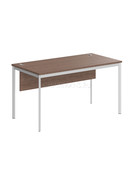 Столешница из ЛДСП т.22мм. Металлокаркас из трубы 40х20х1,5мм, без регулировки внизу. Опоры столов комплектуются пластиковой заглушкой. Покрытие краска белая полуматовая или алюминий. Металлокаркас соединяется со столешницей через металлическую проставку D-16мм. H-6мм. Комплектуется фронтальной панелью из ЛДСП т. 18мм. крепится к столешнице при помощи уголков.
