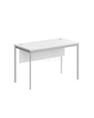 Столешница из ЛДСП т.22мм. Металлокаркас из трубы 40х20х1,5мм, без регулировки внизу. Опоры столов комплектуются пластиковой заглушкой. Покрытие краска белая полуматовая или алюминий. Металлокаркас соединяется со столешницей через металлическую проставку D-16мм. H-6мм. Комплектуется фронтальной панелью из ЛДСП т. 18мм. крепится к столешнице при помощи уголков.