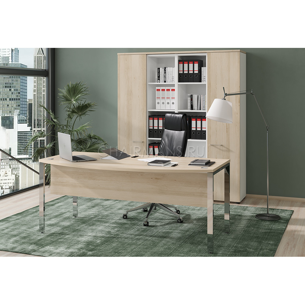 Столешница из ЛДСП толщиной 25 мм c кромкой ПВХ толщиной 2 мм. Опоры металлокаркаса П-образной формы из полированной нержавеющей стали, труба 50х25х2 мм с регулировкой внизу. Комплектуется двумя траверсами, окрашенными порошковой краской.