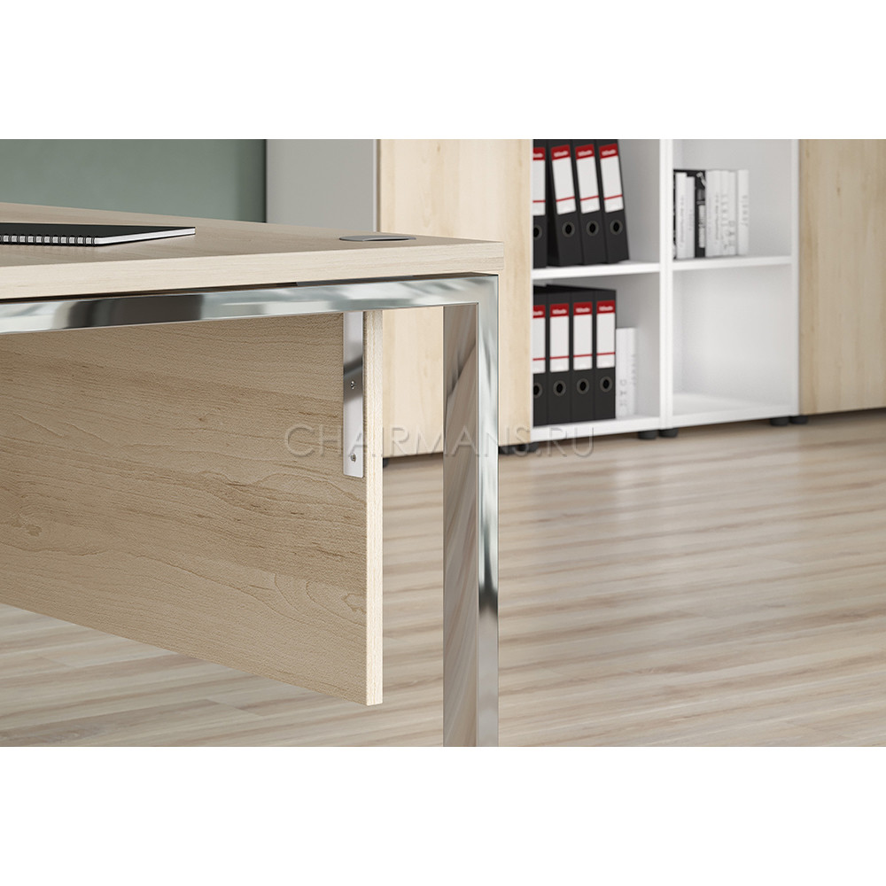 Столешница из ЛДСП толщиной 25 мм c кромкой ПВХ толщиной 2 мм. Опоры металлокаркаса П-образной формы из полированной нержавеющей стали, труба 50х25х2 мм с регулировкой внизу. Комплектуется одной траверсой, окрашенной порошковой краской.
